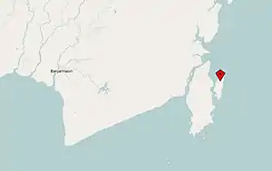 Sebuku is located to the south-east of Borneo, approximately 5 kilometres (3.1 mi) from Laut Island. It is roughly 35 kilometres (22 mi) from north to south and 10 kilometres (6.2 mi) from east to west at its widest point,[1] covering a total area of 275 square kilometres (106 sq mi). Administratively, it is part of South Kalimantan, Indonesia.[2] It is on the Kanibungan Fault.[1]