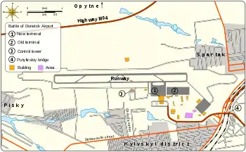 - ↑ "Defense Ministry: Militants blow up Donetsk airport runway". KyivPost. 20 January 2015. Retrieved 2 February 2015.