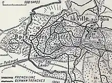 The left flank division of the XXXII Corps and the right division of the V Corps penetrated the German second position south of Juvincourt but French tanks attacking south of the Miette from Bois de Beau Marais advanced to disaster. German observers at Craonne, on the east end of the Chemin des Dames, were able to direct artillery-fire against the tanks and 23 were destroyed behind the French front line; few of the tanks reached the German defences and by the evening only ten tanks were operational.[24][lower-alpha 3] On the left flank, V Corps was stopped at the Bois des Boches and the hamlet of la Ville aux Bois. On the Chemin des Dames, I Corps made very little progress and by evening had advanced no further than the German support line, 200–300 yd (180–270 m) ahead. The French infantry had suffered many casualties and few of the leading divisions were capable of resuming the attack. The advance had failed to reach objectives which were to have fallen by 9:30 a.m. but 7,000 German prisoners had been taken.[25]