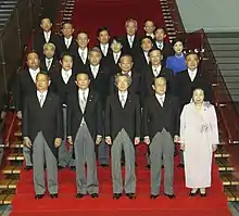 ![]() Prime Minister Junichiro Koizumi (front row, centre) with the re-elected cabinet inside the Kantei, November 19, 2003 | |