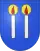 The blazon of the district coat of arms is Argent, a Lion rampant Gules crowned and armed Or on Coupeaux Vert.[3]