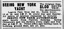 The "Seeing Yacht," for a fare of $1, gave a three-hour tour that circled "the island of Manhatton [sic], showing the statue of Liberty, Blackwell's island [now Roosevelt Island], Jersey City, Brooklyn, Harlem, Bronx, the navy yard, the ocean liners and the wharves, with their commerce and extensive shipping interests."[6][1]