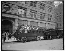 Tours in open-topped buses left from the Flatiron Building (then the Fuller Building), where the windows were painted to advertise "coaches, automobiles, and yachts".[3] The men wore suits, the women wore gloves and elaborate, often feathered hats. They visited "the historic section, in its Dutch, British and American periods; the Bowery, Chinatown, Brooklyn, Castle Garden, Central Park, the Grand Boulevards, the historic Hudson river, Columbia University, General Grant's tomb, [and] statues of Christopher Columbus and William Shakespeare."[1] By 1913, manager J. H. Mulligan and local manager R. H. Green were operating eight vehicles.[2] In 1904, The Evening World described the tours: