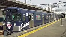 From 17 January 2016, set 9108 operated in a special "L-train" livery consisting of the Saitama Seibu Lions baseball team colour of dark blue with Seibu Lions logos.[8] The set's Seibu Lions logos were removed following its modification for use on the Tamako Line.[4]