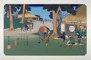 Utagawa Hiroshige's ukiyo-e print of Sekigahara-juku dates from 1835 -1838. The print depicts travelers seated at a roadside noodle shop, which has signs advertising "Satomochi", a sweet rice cake that was a speciality of this area. Straw hats and straw sandals are also on sale. A man leading a packhorse is observing the scene. In the background is another teahouse and many travelers are heading towards it, indicating the busy nature of this post station.