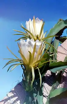 Selenicereus undatus, the white-fleshed pitahaya, is a species of the genus Selenicereus (formerly Hylocereus) in the family Cactaceae[2] and is the most cultivated species in the genus. It is used both as an ornamental vine and as a fruit crop - the pitahaya or dragon fruit.[3]