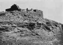 Atop a mound about 200 metres (660 ft) southeast of the oasis vegetation lies the Beit es-Selima, the ruins of an ancient multi-roomed stone structure. Carbon dating and potsherds put the building in use during the Nubian early (AD 600–850) and classical (AD 850–1100) Christian periods. Most pottery recovered was wheel-made and a few decorated pieces were from Aswan.[2] Although not originally fortified, the building dominates the surrounding countryside and in the early 20th century was used a police watchtower or fort (tabia) by the Anglo-Egyptian administration. Theories about its purpose abound. It has been described as a tavern on the Darb al-Arbaʿīn managed by a warrior-princess named Selima and as a Christian convent.[3] The Catholic missionary Theodor Krump described it as the ruins of an eight-celled monastery when he passed through in 1700. Support for this theory may come from the Ḥudūd al-ʿĀlam, a 10th-century Persian geography, which describes two monasteries as lying "in the desert between the Nuba and the Sudan".[4]