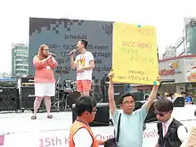 The 15th edition of the festival, taking place in early June 2014 in the Sinchon area of Seoul, near Yonsei University, declared its goal as protesting against "the oppression of LGBT people in Russia and Korea, and show support and solidarity within the LGBT community".[1][12] The 2014 festival lasts over a week, and events include a pride parade and a film festival.[1][2] The 2014 edition received official support from Google.[2][3] The festival organizers have reported that days before the festival was about to start, the government withdrew permission from them, declaring it "inappropriate" in light of the recent Sinking of the MV Sewol tragedy; but the organizers have stated that they believe this is a pretext used by unfriendly Christian groups trying to sabotage the festival by sending numerous complaints to the government. The organizers were prepared to disobey the authorities and hold the event even without official permission.[10][13][14] The festival drew an estimated 10,000-15,000 attendees.[12] The government officials did not prevent the festival from taking place, but also issued permission to conservative, religious anti-LGBT rights groups to hold rallies at the same time and location. This led to a number of disruptions and delays.[12][15]