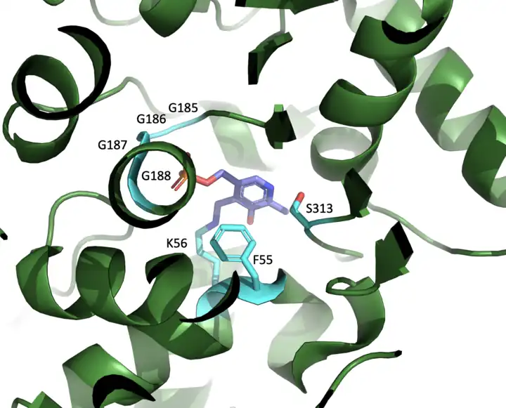 Mammalian serine racemase is a pyridoxal 5'-phosphate dependent enzyme that catalyzes both the racemization of L-serine to D-serine and also the elimination of water from L-serine, generating pyruvate and ammonia through the β-elimination of L-serine.[9] This makes serine a known bifurcating enzyme. The β-elimination pathway is thought to serve as a bleed valve that allows local stores of L-serine to be diverted away from D-serine as a means of muting the D-serine signaling pathway. The canonical tetraglycine loop that serves as a PLP phosphate binding pocket includes the active residues being F55, K56, G185, G186, G187, G188, and S313.[8]