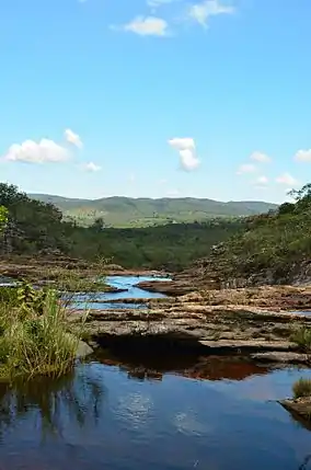 The park covers part of the Espinhaço Mountains.[2] These are recognized by UNESCO as one of the world's biosphere reserves.[3] An internal road leads to the former transmission tower of TV Leste on one of the highest points of the region at 1,581 metres (5,187 ft). From this point there is an extensive view of the surrounding mountains.[4] The park is in the Jequitinhonha River basin, and contains the sources of many watercourses that feed that river, the Araçuaí River and tributaries of the Doce River.[2]