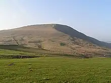 The hill at the end of Rushup Edge is over 500m high with clear views up the Hope Valley and across to Kinder Scout. Its name means Mother Hill. The hill is owned and managed by the National Trust.[14] The south east face is subject to continual landslides and the unstable A625 road across it was permanently closed after 1979 (so that all traffic now goes through Winnats Pass).[15] The updraft winds created by the steep face make the hill a popular location for paragliders. The Bronze Age hillfort and burial mounds are a protected Scheduled Monument.[16]