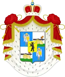 The first and third sections of the shield are the arms of the Great Duchy of Kiev. The second and fourth sections are the arms of the Principality of Smolensk. In the middle of the arms a smaller shield bears the arms of the Yaroslav Principality.