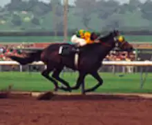 Sham (April 9, 1970 – April 3, 1993) was an American thoroughbred race horse and leading three year-old in 1973, who was overshadowed by his more famous peer, Secretariat. Sham was dark bay, almost black in color. He raced in the green and yellow silks of his owners, Sigmund and Viola Sommer, with matching blinkers. His running style was that of a stalker, preferring to run behind the early leaders and gradually improving his position nearing the finish. Sham was a large horse at 16.2 hh.[1] He also had a very large heart, about twice the size of the average horse's, as discovered during the necropsy following his death.[1]