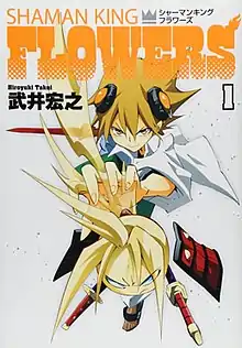 Shaman King: Flowers (Japanese: シャーマンキングFLOWERS, Hepburn: Shāman Kingu Furawāzu) is a Japanese manga series written and illustrated by Hiroyuki Takei. It is a sequel to Takei's original manga series Shaman King. It was serialized in Shueisha's Jump X from April 2012 to October 2014, with its chapters collected in six tankōbon volumes. An anime television series by Bridge premiered in January 2024.