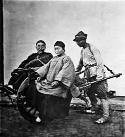 A Shanghainese man and woman on a wheel barrow, pre-1898.