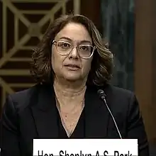 On September 6, 2023, President Joe Biden announced his intent to nominate Park to serve as a United States district judge of the United States District Court for the District of Hawaii.[3] On September 27, 2023, her nomination was sent to the Senate. President Biden nominated Park to the seat to be vacated by Judge Leslie E. Kobayashi, who will assume senior status on October 9, 2024.[7][8] On October 4, 2023, a hearing on her nomination was held before the Senate Judiciary Committee.[9] On October 26, 2023, her nomination was reported out of committee by a 12–9 vote.[10] On November 29, 2023, the United States Senate invoked cloture on her nomination by a 53–44 vote.[11] On November 30, 2023, her nomination was confirmed by a 53–45 vote.[12] She is awaiting her judicial commission. Once commissioned, Park will be the first and only Native Hawaiian woman on the federal bench.[13][14]