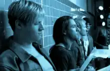 The band is standing against a wall facing the camera, with a blue filter. The band name and song title is positioned underneath them.