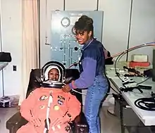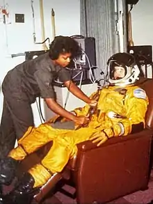 Sharon McDougle and Mae Jemison in KSC Suit Room