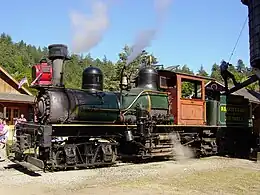 • The Woodstock Lumber Co. Class B Shay No. 5, Shop No. 2958 is owned by Clark's Bears, formerly Clark's Trading Post, in Lincoln, NH. Built in 1917 and bought by the Woodstock Lumber Co., new, in 1919. The 2-truck 50-ton was used as a switcher in their yard.[25] Other sources say that the locomotive saw service on the Beebe Railroad in Campton, NH, as well as the East Branch & Loncoln Railroad.[26] The Woodstock Lumber Company became the Franconia Paper Co., and Clark's bought it from them between 1951 and 1952. The shay is not operational currently, and there are no known plans to restore it.[25] It can sometimes be found on display, along with the disassembled components of Clark's Heisler Locomotive.