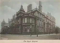 The hospital was completely rebuilt in the early 1890s and was officially opened by the Duchess of York as the Sheffield Royal Hospital on 11 May 1895.[2] A new nurses' home was completed in the late 1890s.[2] The Mount Zion chapel on Westfield Terrace, with its impressive facade in Classical Revival style with projecting portico with pediment and a pair of giant Ionic columns in antis, was acquired in 1922.[2] Once the chapel had been converted into an out-patients department, it was officially opened in its new role by the Minister of Health, Neville Chamberlain, in 1927.[2]