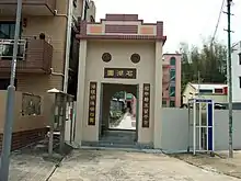 The village has an entrance gate, rebuilt in 1965, that features two circular holes above the front doorway for feng shui and practical security watching purposes. An Earth God shrine is located within the gate. Other shrines in the village include a Pak Tai shrine and another Earth God shrine.[2]