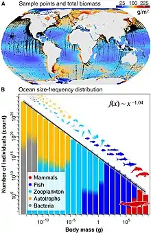 The inverse correlation implies that biomass density as a function of logarithmic body mass is approximately constant over many orders of magnitude.[2] For example, when Sheldon and his colleagues analyzed a plankton sample in a bucket of seawater, they would tend to find that one third of the plankton mass was between 1 and 10 micrometers, another third was between 10 and 100 micrometers, and a third was between 100 micrometers and 1 millimeter. To make up for the differences of size, there must be a remarkably accurate mathematically correlative decrease in number of organisms as they become larger, in order for the biomass to remain constant. Thus, the rule predicts that krill which are a million times smaller than tuna are a million times more abundant in the ocean, a prediction which appears to be true. [3]