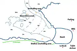 Facilities include 2 free electric barbecues, showers, toilets and a kiosk selling meals, drinks and coffee. There is a restaurant on the beach called The Boathouse Shelly Beach.[12] There is a bush track around the headland with views of the Northern Beaches and North Head. The facilities also include parking at the rate of $8.00 an hour. Many scuba diving centres take students because it offers excellent conditions for an environment in which to learn SCUBA.[13][14]