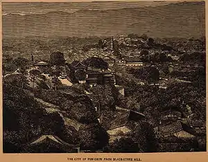 Following the footsteps of the American Board of Commissioners for Foreign Missions (ABCFM) and the Methodist Episcopal Mission (MEM), the English Church Missionary Society established a mission at Fuzhou during the spring of 1850.[1] During first few days since their arrival they resided temporarily on Zhongzhou Island (中洲岛), together with their American predecessors. As the Methodists had moved south of the River Min and the ABCFM northwards into the Nantai, the CMS missionaries, Robert David Jackson and William Welton, decided to seek assistance from the British consulate to secure premises within the walled city (which is located within the present day Gulou District). They considered Wu-shih-shan (乌石山; Black Stone Hill), the tallest hill of Fuzhou, to be the most desirable site not only because the British consulate had been located there for years already but also because, living on the hill, they would "never go out or come in without being occasionally reminded of the vastness"[2] of their work.