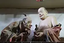 Qiongzhu Temple painted clay sculptures of one Buddhist Arhat looking at another's shengtai, created by Li Guangxiu (黎廣修) and his students between 1883 and 1890