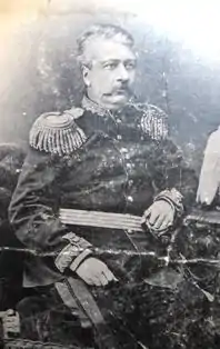 During the Russo-Turkish War of 1877–78, Şerif Bey refused to serve the Ottoman cause and supported the Russians in their unsuccessful attempt to occupy Batum and Adjara.[4] An Ottoman detachment razed the bey's mansion in Skhalta as he fled to Akhaltsikhe. By the Treaty of Berlin of 1878 Adjara became part of the Russian Empire. In November 1878, Şerif led a delegation of Adjarian notables to meet Georgian writers and public figures in Tiflis on the occasion of reunion of Adjara with the rest of Georgia under the Russian rule. Şerif Bey's services were rewarded by the Russian government by granting security to his land holdings and the rank of major-general to which Şerif Bey, now known as Sherif-Beg Adzharsky, was promoted in February 1879. He was enlisted with the Caucasian Military District from 1879 to May 1891. In 1883, he converted to Orthodox Christianity and was baptized as Aleksandr Aleksandrovich Adzharsky.[2]