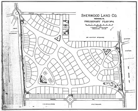 Among the streetcar suburbs commissioned in 1891 by local businessman Lewis Ginter, Sherwood Park's original design was laid out in 1892 by the firm of acclaimed landscape architect Frederick Law Olmsted.[1] Due to economic, social, and political factors during Ginter's lifetime, Olmsted's elegant design of gently curved streets was never realized. Development of modern Sherwood Park accelerated during the late 1920s and continued through 1940–1950. Today the community has evolved into a diverse neighborhood of tree lined streets, bike lanes, a variety of architectural styles and sidewalks throughout.