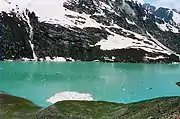 Sheshnag Lake (Urdu pronunciation: [ʃeːʃnaːɡ] ; Kashmiri pronunciation: [ʃiːʃinaːɡ]) is an alpine high elevation oligotrophic lake[1] located in Anantnag district of Kashmir Valley in Jammu and Kashmir, India at an elevation of 3590 meters. It is situated on the track leading to the Amarnath cave, about 23 km from Pahalgam. It has a maximum length of 1.1 km and maximum width of 0.7 km.