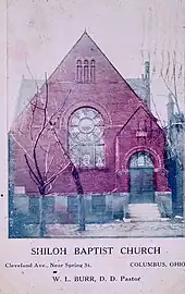 Shiloh Baptist Church was formed by a group of former members of the city's Second Baptist Church. Seeing the city's black population increasing rapidly, especially on the near east side, Second Baptist leaders asked for volunteers to leave and form a new church; these volunteers formed the entire charter membership of the new Shiloh church. From their first meeting in 1869 until 1871, they worshipped in a rented property at Gay and Fourth Streets downtown, after which they moved a few blocks eastward to Cleveland Avenue and Long Street. The congregation again moved in 1923 upon the completion of the present building on Mount Vernon Avenue, significantly farther east than the previous houses of worship.[3] A minister, James Burks, was responsible for the design, with additional work being performed by the A.O. Day Construction Company.[1] The congregation came close to losing the building during the Great Depression, due to its inability to pay the mortgage, but was delivered by an unexpected act of mercy: upon obtaining title through foreclosure, the bank promptly contracted to return the property to the church.[3] Since that time, the building has become recognized as one of the premier components of the surrounding neighborhood, Mount Vernon.[4]