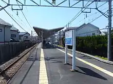 The station consists of a ground-level island platform serving two tracks, connected to the station building by a footbridge.[2]