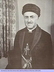 Mar Eshai was born on the 26th of February, 1908 in Qudchanis, the mountainous region located in southern Turkey. Mar Eshai was raised with great care while received the necessary theological and liturgical training by the Archdeacon of the Patriarch, Thoma of Ashita and by the Metropolitan of Rustaqa, Mar Yosip Khnanishoo, who was also his uncle. At the age of twelve, due to geopolitical upheavals at the time, Mar Eshai was ordained as Patriarch in 1920, succeeding his uncle, Mar Poulus Shimun, XXII.[2] He was educated in England, studying theology at Canterbury and at Westcott House, University of Cambridge.[1] As early as 1926 at the age of 18, the Patriarch attended the Nicene Council Commemoration held at Westminster Abbey, London. The Church and State Conference held in Oxford and the Faith and Order Conference held in Edinburgh were both attended by Mar Eshai in 1937. The distinguished Athenaeum Club of London had favoured Eshai by conferring an honorary membership. He was also a member of the American Historical Society and other organizations, as well as being a representative to the World Council of Churches and being given an entry in Who's Who. Numerous appeals and publications concerning the Assyrian Question, written by the Patriarch and presented to the British Government and various international bodies, highlight him as a writer of distinction.[2] He was the translator or author of several books on the theology and history of the Church of the East (see "Works" section.) The volatile political environment and uncertainties for the church caused in 1933 by the independence of Iraq from the British mandate rule forced the patriarch to be exiled to Cyprus, away from the new see in Bebadi. In 1940, he relocated again, to Chicago, Illinois, in the United States.