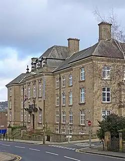The new building was designed in the Neo-Georgian style and was opened by the Lord Lieutenant of the West Riding of Yorkshire, the Earl of Harewood, on 2 December 1932.[8][9][10] The earl unveiled a plaque in the entrance hall and was presented with a key decorated with the town's coat of arms in enamel.[8] The design involved a symmetrical main frontage with thirteen bays facing onto Kirkgate with the end bays projected forward; the central section of three bays, which also projected forward, featured a flight of steps leading up to a doorway flanked by banded pilasters and brackets supporting an iron balcony which was accessed from a French door. There were three tall sash windows on the floor above and, at roof level, there were a modillioned cornice, four urns and three dormer windows. Internally, the principal room was the council chamber.[11]