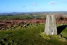 The oval enclosure (the longest dimension being west to east) has natural slopes to the west and east, but is steepened to the north and south. At the base of the hill there are banks with dtches: on the south, the bank has width about 10 metres (33 ft) and height 2.5 metres (8 ft 2 in), cut by a modern track, and on the north the bank has width about 10 metres (33 ft) and height 1.3 metres (4 ft 3 in). Near the centre of the enclosure is a small circular mound, diameter 10 metres (33 ft) and height 0.2 metres (7.9 in), on which is a modern trig point; the mound may possibly be a bowl barrow.[1][3]