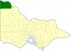 The Shire of Mildura was a local government area located at the northwestern corner of Victoria, Australia, on the Murray River and the South Australian border. The shire covered an area of 10,145 square kilometres (3,917.0 sq mi), and existed from 1890 until 1995. From 1920 onwards, Mildura itself was managed by a separate entity, ultimately known as the City of Mildura.