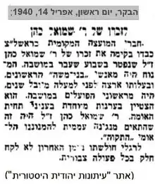 - Obituary Samuel Cohen, Haboker Palestine Newspaper, April 14, 1940