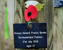 The memorial is to servicemen executed by firing squad during the First World War. It has been argued that soldiers accused of cowardice were often not given fair trials; they were often not properly defended, and some were minors.[2][3] Other sources contend that military law, being based on Roman rather than Common law, appears unfamiliar to civilian eyes but is no less fair.[4][5] It was the court's role to establish facts, for example, not for prosecutors and defenders to argue their cases; and Holmes states "it was the first duty of the court to ensure the prisoner had every advantage to what he was legally entitled".[6] Defendants often chose to speak in their own defence.[7] The usual cause for their offences has been re-attributed in modern times to post-traumatic stress syndrome and combat stress reaction.[2][3] Another perspective is that the decisions to execute were taken in the heat of war when the commander's job was to keep the army together and fighting.[8]