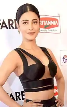 Haasan's subsequent releases Oh My Friend (2011) and 3 (2012) were commercially unsuccessful.[6][7] The latter earned her a nomination for the Best Actress – Tamil at the 60th Filmfare Awards South ceremony.[8] A turning point came in Haasan's career with Harish Shankar's commercially successful Telugu film Gabbar Singh (2012).[9] The release was followed by a series of successful films such as Balupu (2013) and Yevadu (2014).[10][11] She received her first Filmfare Award for Best Actress – Telugu for her performance in Race Gurram (2014).[12]