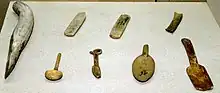 The technology and typology of bone-based instruments are similar to those of the Middle East Neolithic material culture. A quern with 2 small hollows found in Shomutepe is similar to the one with more hollows detected in Khramisi Didi-Gora(Georgia). The similarities between the macrolithic tools and the use of ochre also bring Shulaveri–Shomu culture closer to the culture of Halaf. Pestles and mortars found in Shulaveri–Shomu sites and Late Neolithic layers of Tell Sabi Abyad in Syria are also similar to each other.[4]