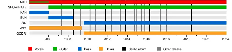 In 2006, SHOW-HATE joined and picked up guitar; KAH left the band, then BUN joined on bass until 2008.