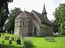 Gambier-Parry designed the coped tomb of his father, which is positioned in the churchyard east of the chancel of the Church of the Holy Innocents. The monument to Thomas Gambier-Parry is Grade II listed.[23][24][25] The architect also worked on the sanctuary and chancel arch of All Saints' Church on Oakleigh Road North in Friern Barnet, London.[26][27] In 1889 he restored the Church of St Margaret in Bagendon, Gloucestershire, now Grade 1 listed.[28] Improvements made to the Grade II* listed Church of St Mary in Bayford, Hertfordshire in 1890 were to his design.[29] Gambier-Parry made design changes to the Grade II* listed Church of St James in Quedgeley, Gloucestershire about 1890,[30] and later designed the Quedgeley War Memorial in the churchyard.[31] The glass in the chancel east window of Elmore Church in Elmore, Gloucestershire, was dedicated to Sir William Vernon Guise and designed by Gambier-Parry in 1890.[32] He also made improvements to Elmore Court in Elmore, Gloucestershire in the late 19th century.[33] In 1894 to 1895, he restored and enlarged the Grade II* listed St James' Church in Cranham, Gloucestershire.[34][35] In 1895 he made design changes to St Michael Church in Boulge, Suffolk, on behalf of the Holmes White family.[36] Gambier-Parry was also responsible for the late 19th century alabaster-work in the sanctuary of the Lady Chapel of St Mary the Virgin, Bathwick.[37] He was the architect of Whitemoor, opposite Amberley Church, in the western part of the parish of Minchinhampton, Gloucestershire.[38] In 1908, Gambier-Parry designed the Grade II listed Iveson Manor in Ampney St Peter, Gloucestershire.[39] About 1908, the first vicar of the Grade II* listed St Mary the Virgin, Bourne Street in London selected him to replace the reredos of the high altar. The architect installed an arch fabricated of dark wood and, above the arch, ornamentation in a sunburst design.[40][41] He also built the organ case and loft for St Mary's Bourne Street, using an English baroque style, with pediments, scrollwork, and finials.[40][42] The Grade II listed Pytte House of Clyst St George, Devon, was renovated and enlarged by Gambier-Parry in 1911.[43] In the 1930s, he restored St Michael's Church (pictured) at Duntisbourne Rouse in Gloucestershire, at the same time living in the nearby old rectory.[44][45] The church was Grade I listed in 1958.[46]