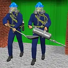 CGI image. 2 workmen with Siebe Gorman Salvus rebreathers set off to clean up a building after fumigation.