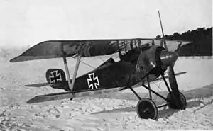 The French Nieuport 17 fighter, which reached the front in March 1916, established such ascendency over existing German fighters that captured examples were supplied to several German aircraft manufacturers with a request to "study" the type.[1] The Siemens-Schuckert Werke produced the D.I, based very closely on the Nieuport. The most important difference from the Nieuport 17 was the powerplant - instead of the Le Rhone 9J of the Nieuport (licensed, as with the Oberursel Ur.II; and un-licensed versions of which were actually available in Germany at the time), Siemens-Schukert chose to use their own 110 hp (82 kW) Siemens-Halske Sh.I rotary engine - in which the cylinders, still attached to the propeller, rotated at 900 rpm in one direction, with the crankshaft and internals rotating in the opposite direction at the same rate: producing an effective 1800 rpm. Visually, the effect of this was that in place of the Nieuport 17's circular, fully "closed" cowling the D.I had a small, close-fitting, semicircular cowling with an open bottom, to allow adequate cooling for the slow revving Siemens-Halske. This gives some photographs of the type the appearance of the earlier Nieuport 11.