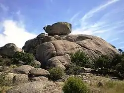 The Sierra de Hoyo is distributed forming a sort of inverted arc, whose ends are guarded by the peaks of Navalospinos (1171 m) —to the northeast—, El Picazo (1268 m) ―to the south― and Peña Cardín (1130 m) —to the northwest—. In its southeastern foothills there are different mountains that serve as a transition to El Pardo, as in the case of La Solana (1002 m) in Hoyo de Manzanares and, to the south, the occasional isolated formation rises, as in the case of Canto del Pico (1005.887 m).[2] The latter, within Torrelodones, which is one of the most important granite formations in the surroundings of the sierra, is dominated by a modernist palace, which was owned by Francisco Franco, to which it gives its name.