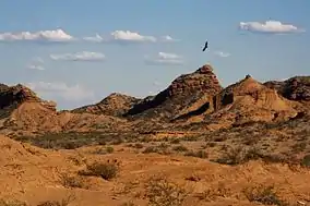 The variation of elevation is mainly between 500 and 900 mamsl. The Desaguadero River valley is below 500 m, while some peaks are above 900 m: Cerro El Portillo and Cerro El Lindo are below 1090 m, Cerro Los Viejos is 920 m Cerros de la Aguada and Cerros de la Vidriera approach 850 m.[10] The whole area is divided into 6 physiographic units: the Desaguadero River flood plain, the Arroyo de la Aguada circular valley, steppe, foothills, and slopes and summits. The shaping of the landscape in the region is mainly due to the erosion caused by water from occasional rains and erosion by wind.[3]