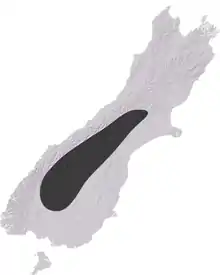 Sigaus australis can be found in the southern half of the South Island, from Otago and Canterbury regions. It can be found as far south as the Takitimu Mountains[6] and as far north as the Torless Range (43°14′39″S 171°48′34″E / 43.244052°S 171.809578°E / -43.244052; 171.809578). Sigaus australis prefer tussock grasslands between 1,300–1,700 metres (4,300–5,600 ft) elevation, however, can be found as low as 200 metres (660 ft) on the Alexandra Tailings, (45°14′49″S 169°22′07″E / 45.246895°S 169.368559°E / -45.246895; 169.368559)[7] and as high as 2,000 metres (6,600 ft) on Smite Peak (43°21′10″S 171°14′17″E / 43.35276073°S 171.2380887°E / -43.35276073; 171.2380887). Evidence from mtDNA sequencing suggests that S. australis encompasses several narrow endemic taxa and one widespread species.[7]Sigaus australis would have been more widespread during the last glacial period with both morphological and genetic signature of greater population connectivity in the past.[6] With climate warming and low dispersal potential, S. australis will probably lose 75% to 93% of its suitable habitat by 2070.[8]