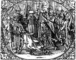Engraving from Herberstein's book. Ambassadors presenting gifts to the Tsar of Muscovy